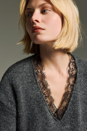 Γυναικεία V neck lace knit Μπλούζα-Γκρί