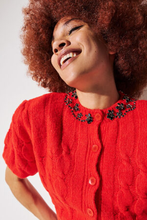 Γυναικεία Cropped Knit With Stones Sewn Handmade Ζακέτα-Kόκκινο