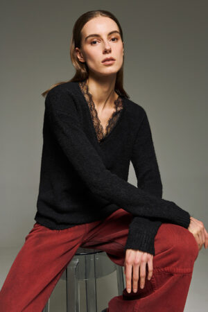 Γυναικεία V neck lace knit Μπλούζα-Μαύρο