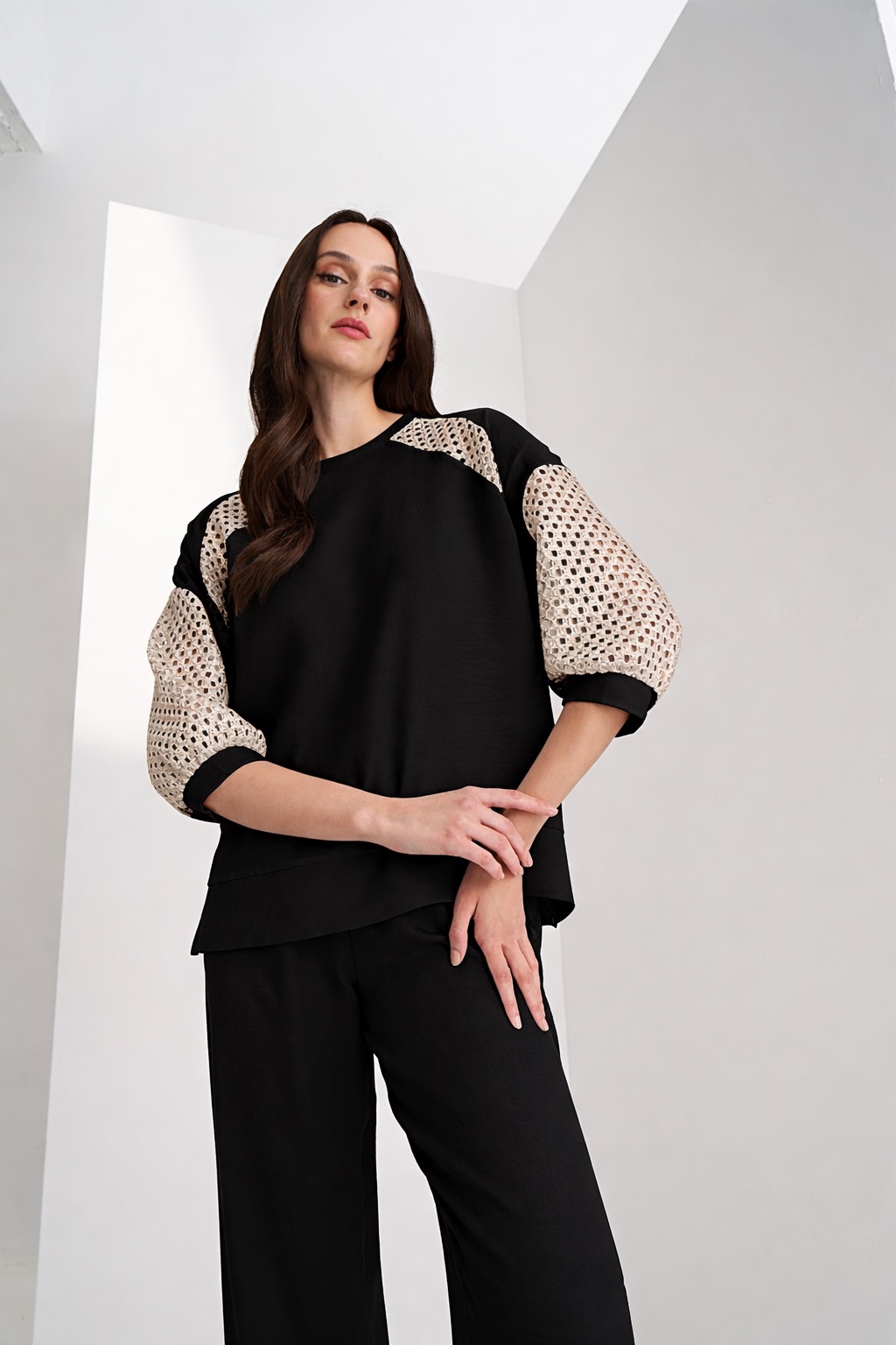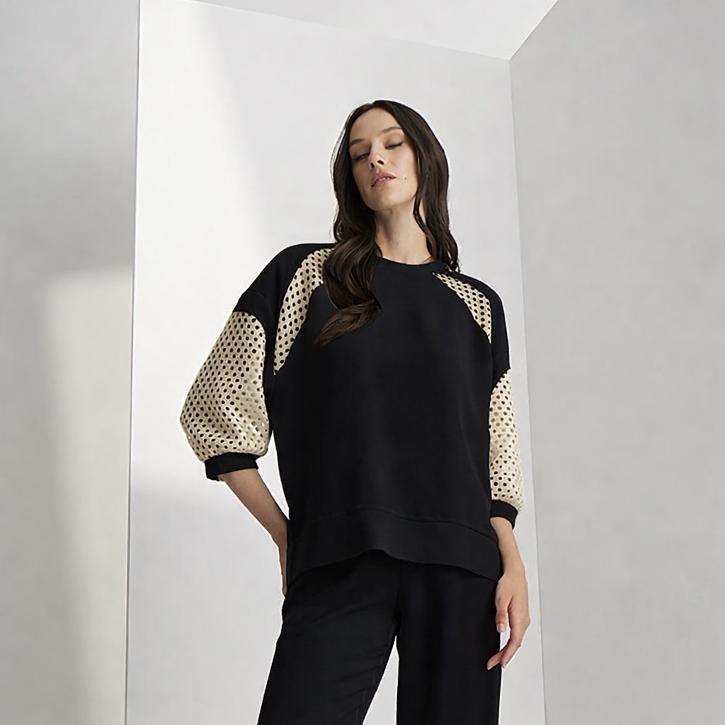 Γυναικεία Gold Mesh Sleeve Μπλούζα-Mαύρο