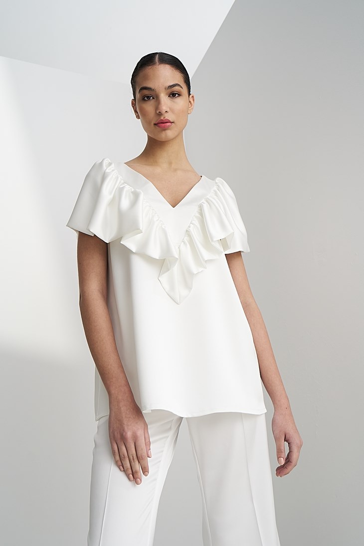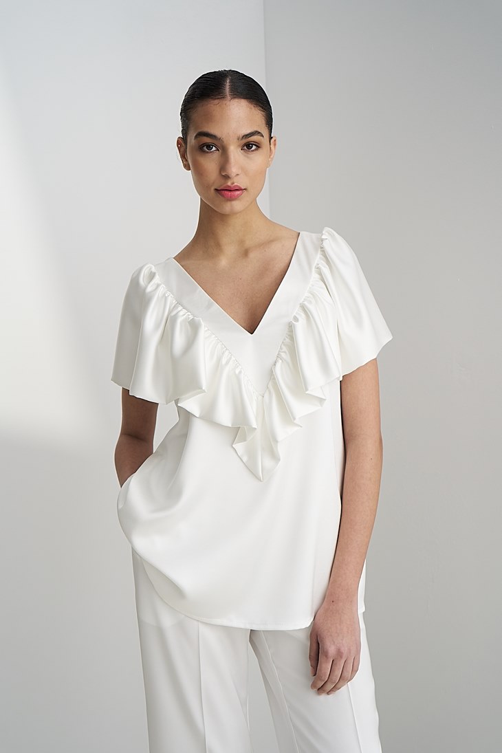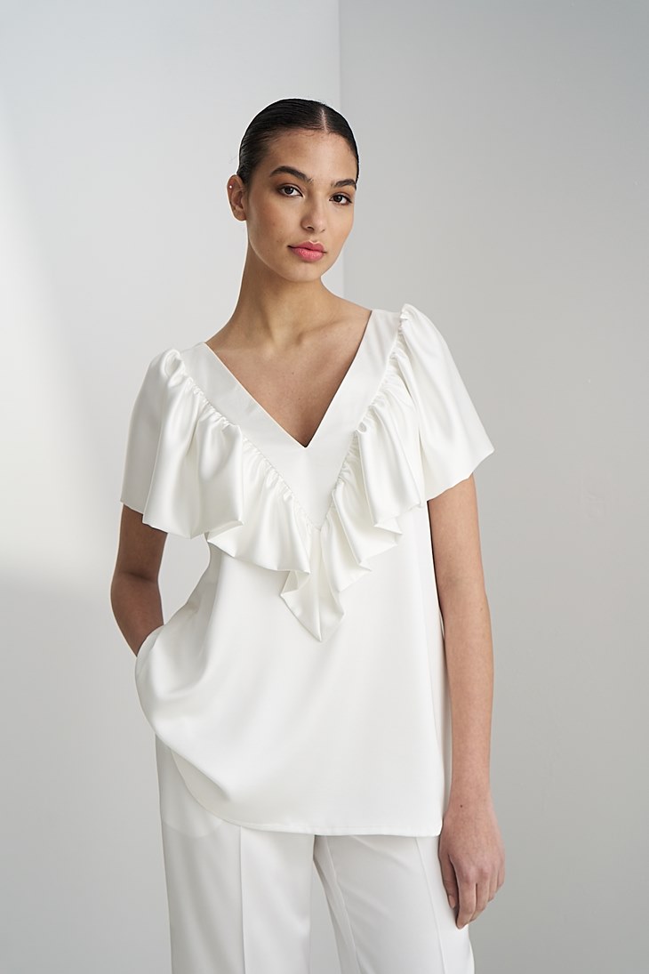 Γυναικεία Satin Ruffle Μπλούζα-Λευκό